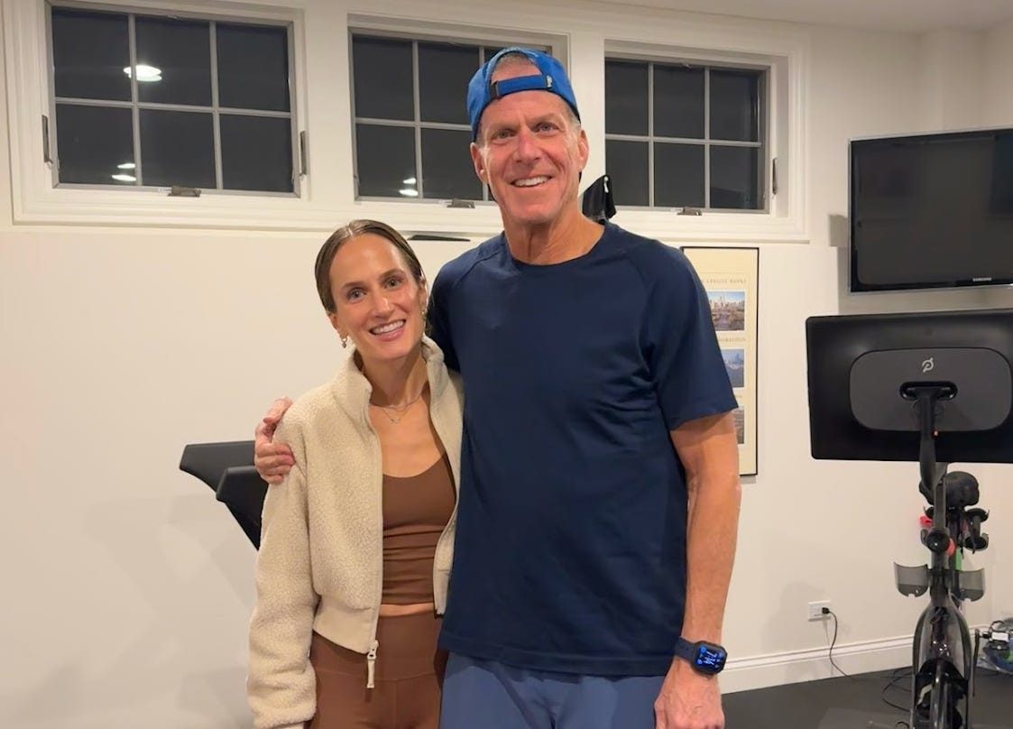 When I’m in Chicago, my dad and I do Peloton strength together every day. No negotiating. Even during chemo, we open the app, pick a class, and move.